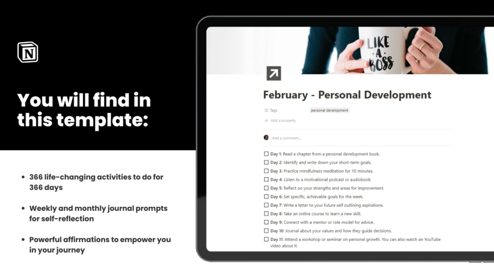 Embark on a year-long journey of self-discovery and transformation with our exclusive 366-Day Self-Improvement Challenge Notion Template. Crafted to guide you through each day, this template is your passport to a more empowered and fulfilled life.